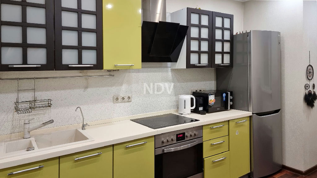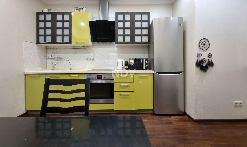 - Кухня-столовая с гарнитуром "Стильные кухни" под единой столешницей из искусственного камня с духовым шкафом и стильной вытяжкой, хромированный холодильник LG всё это остается подарок счастливому покупателю.